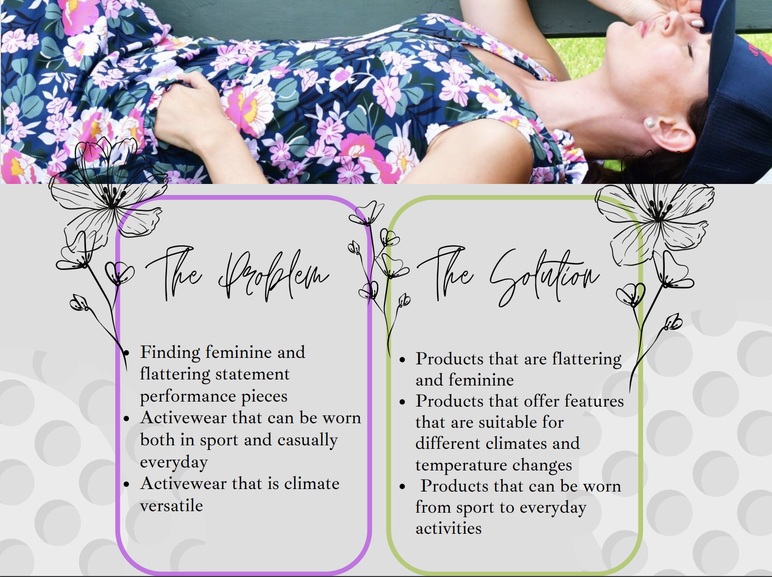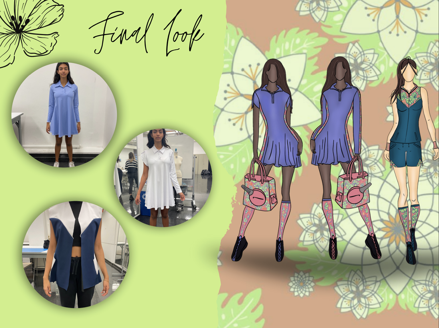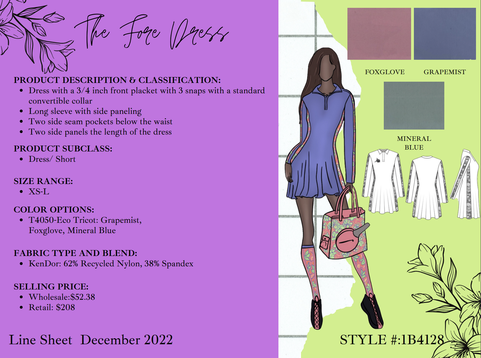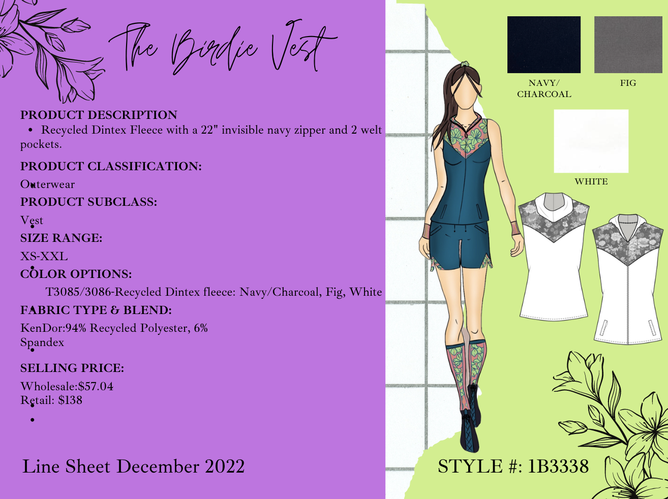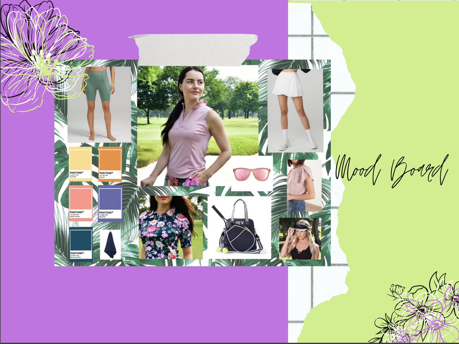 Objective: Designing Women’s Active Wear as an expansion for the 2024 collection. In this year-long capstone course, four teams of eight students competed for the designs to be selected and produced. Each member of the team collaborated across cross-functional teams including: three designers and five merchandisers. The directive from Ellie was to expand her brand by designing new patterns for her line, accessories, and a potential print. Using research from competing brands, interviews, and searching what is missing in the current market, my team was able to design a product line that used color and style choices to match the Ellie Day’s personal aesthetic.